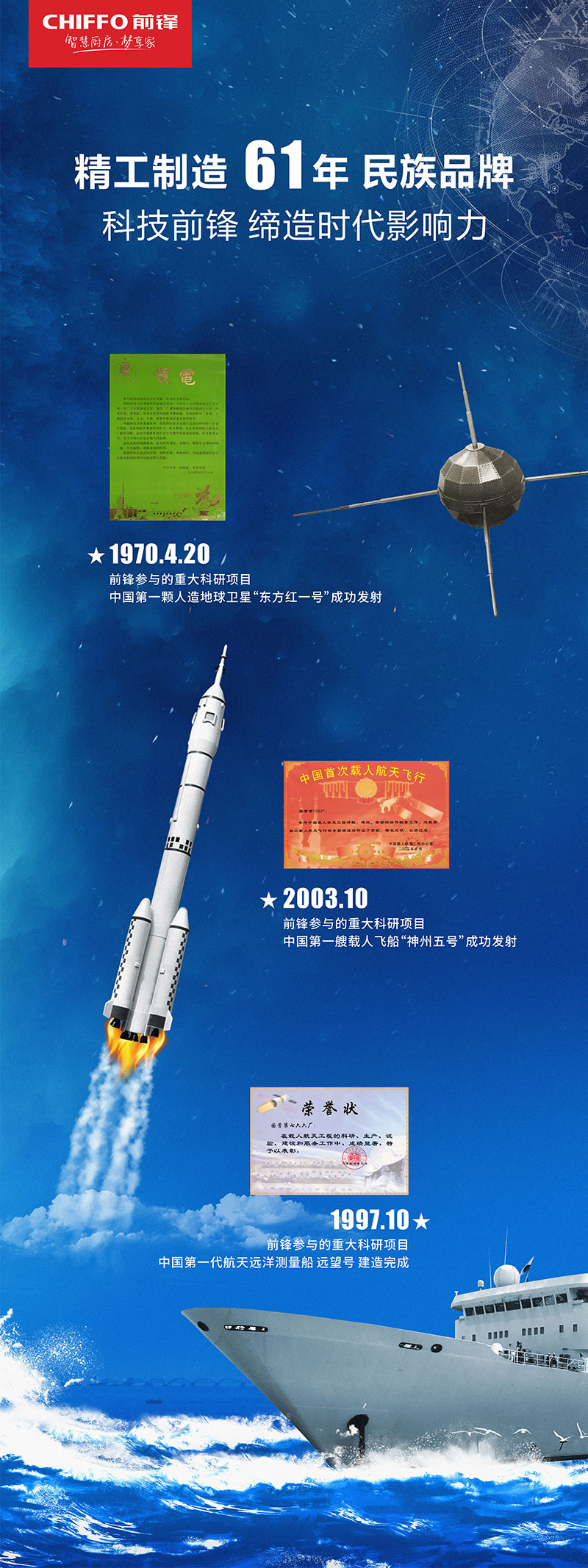 前鋒作為行業(yè)知名的技術(shù)先導(dǎo)型企業(yè),擁有六十一年的發(fā)展歷程,在新中國成立之后的這70年發(fā)展進(jìn)程中,緊隨國之發(fā)展,擔(dān)歷史使命,先后參與了眾多國家重大科研項(xiàng)目,其中包含中國第一顆人造衛(wèi)星“東方紅一號”成功發(fā)射,中國第一艘載人飛船“神舟五號”成功發(fā)射,中國第一代航天遠(yuǎn)洋測量船“遠(yuǎn)望號”建造完成等。
