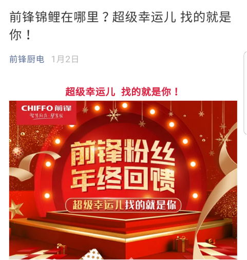 2019年1月2日,前鋒廚電官方微信平臺發布了前鋒錦鯉活動,活動機制非常簡單,消費者只需要轉發活動圖文,并填寫報名信息,便有機會成為此次活動的幸運錦鯉,一人獨享含熱水器、吸油煙機、燃氣灶、嵌入式洗碗機、電蒸汽爐、電烤箱、空氣凈化器、凈水器、暖風機9大品類價值37576元的前鋒廚電全線新品大禮包。