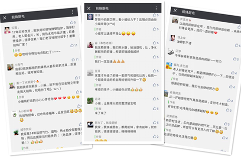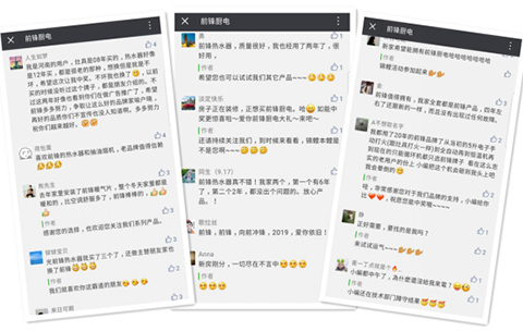 活動剛一發布,就引發了“鋒蜜”們的踴躍參與,大家紛紛在朋友圈轉發前鋒錦鯉的圖文,并在微信后臺留言,講述自己與前鋒之間的故事,還紛紛表達了希望自己能中得頭彩的新年愿望,甚至有網友表示,前鋒這次太夠意思了,簡直不要太壕,這是敦促他們買套新房子來裝這全套廚電新品的節奏啊!