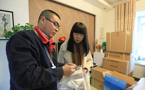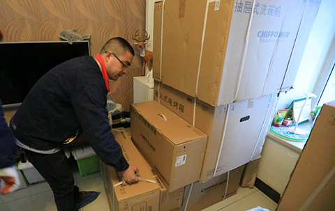 前鋒工作人員將前鋒廚電全線新品大禮包送至幸運兒家里